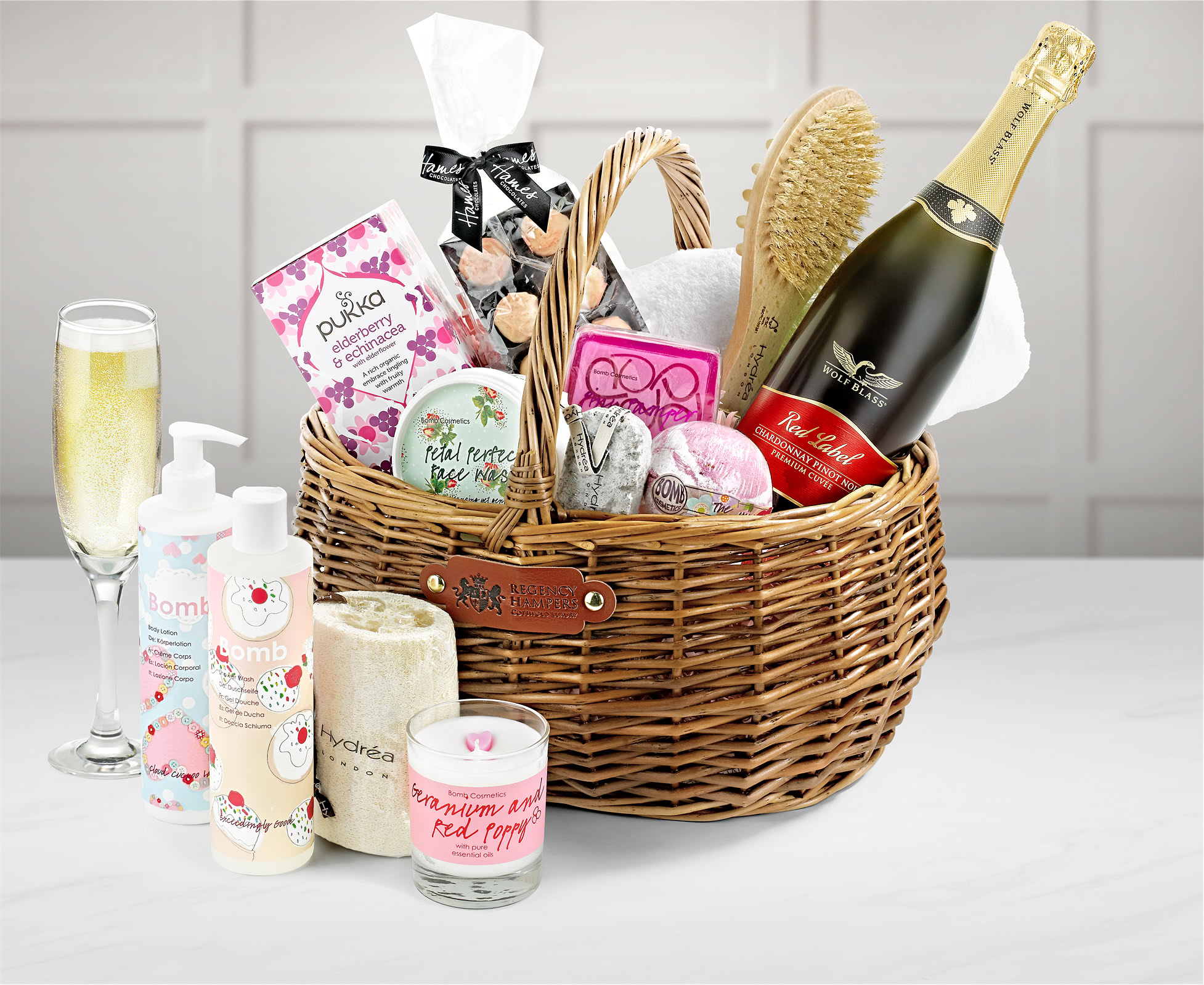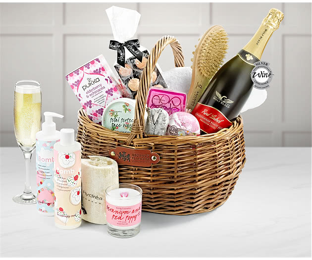 This Luxury Pampering Set Gift Basket with Red Wine contains so many items to create a romantic and relaxing occasion including a luxurious bottle of sparkling Australian white wine plus a wonderful range of bath-time treats. Inside this pretty wicker shopping basket you'll discover a superb bottle of Wolf Blass Red Label Sparkling Premium Cuvee White Wine plus a restoring packet of Twinings Echinacea and Raspberry Tea. We also add delicious Prosecco Truffles while for relaxing pleasure we add a scented bath bomb together with luxury items from Bomb Cosmetics featuring Pink Pamper Soap and In The Pink Body Lotion. A scented candle helps create a romantic mood while we include a massage brush, a Chinese loofah and a handy pumice stone to deliver extra pamper power. There is even a white cotton bath towel to complete a relaxing bath. This Regency Hampers luxury pamper gift is beautifully presented and tied with a golden ribbon. You can also add a personal greetings message to your gift when you place your order. As this gift hamper contains alcohol it is not suitable for under 18s.
