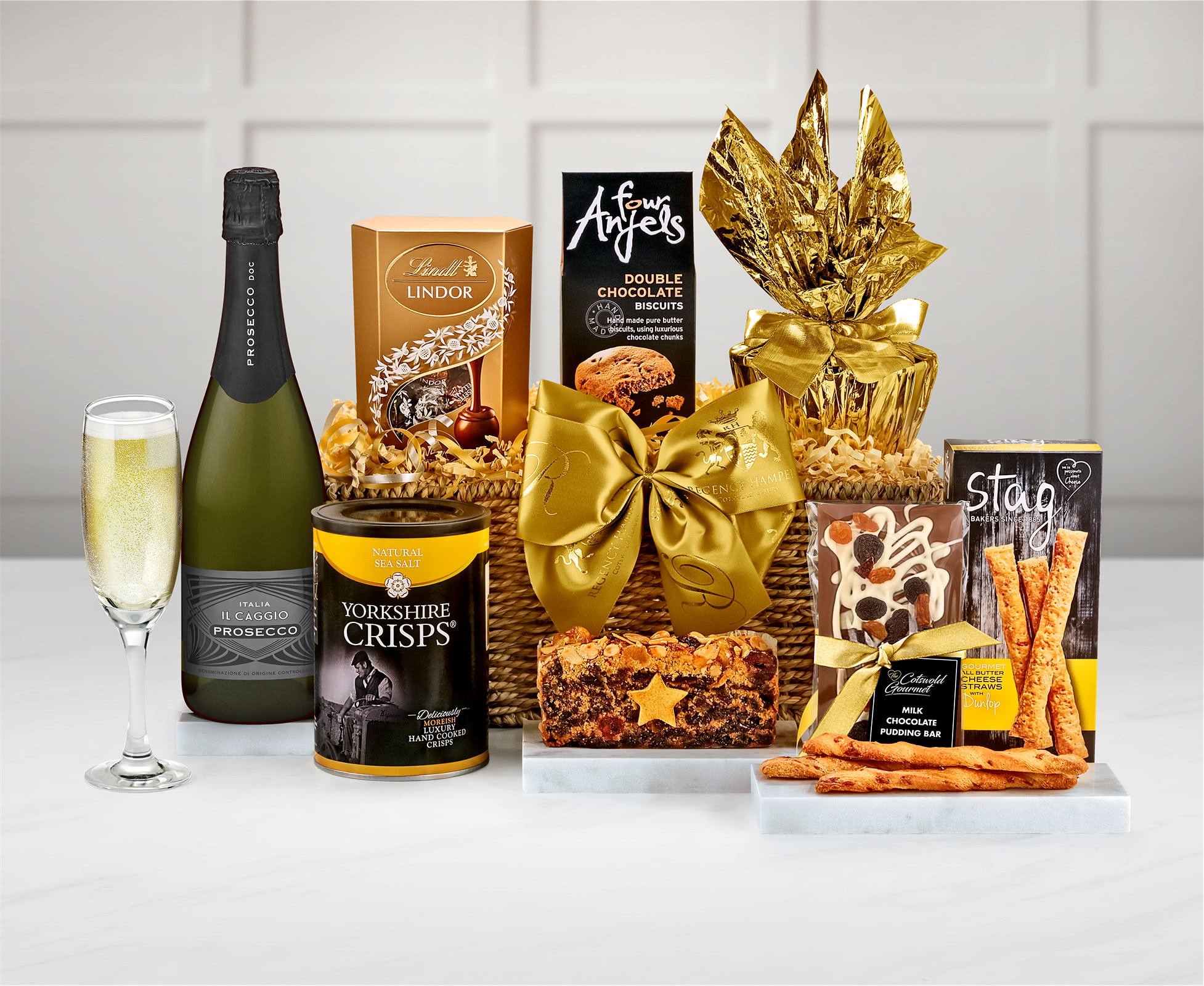 Personalised Prosecco Centrepiece: This luxury gift basket comes with a bottle of top-shelf prosecco - with the option to engrave with a message of your choice, adding that personal touch that takes any celebration to the next level. A sparkling wine like this requires no reason at all to be opened up and enjoyed, but we've selected it to pair beautifully with the treats that come with it.