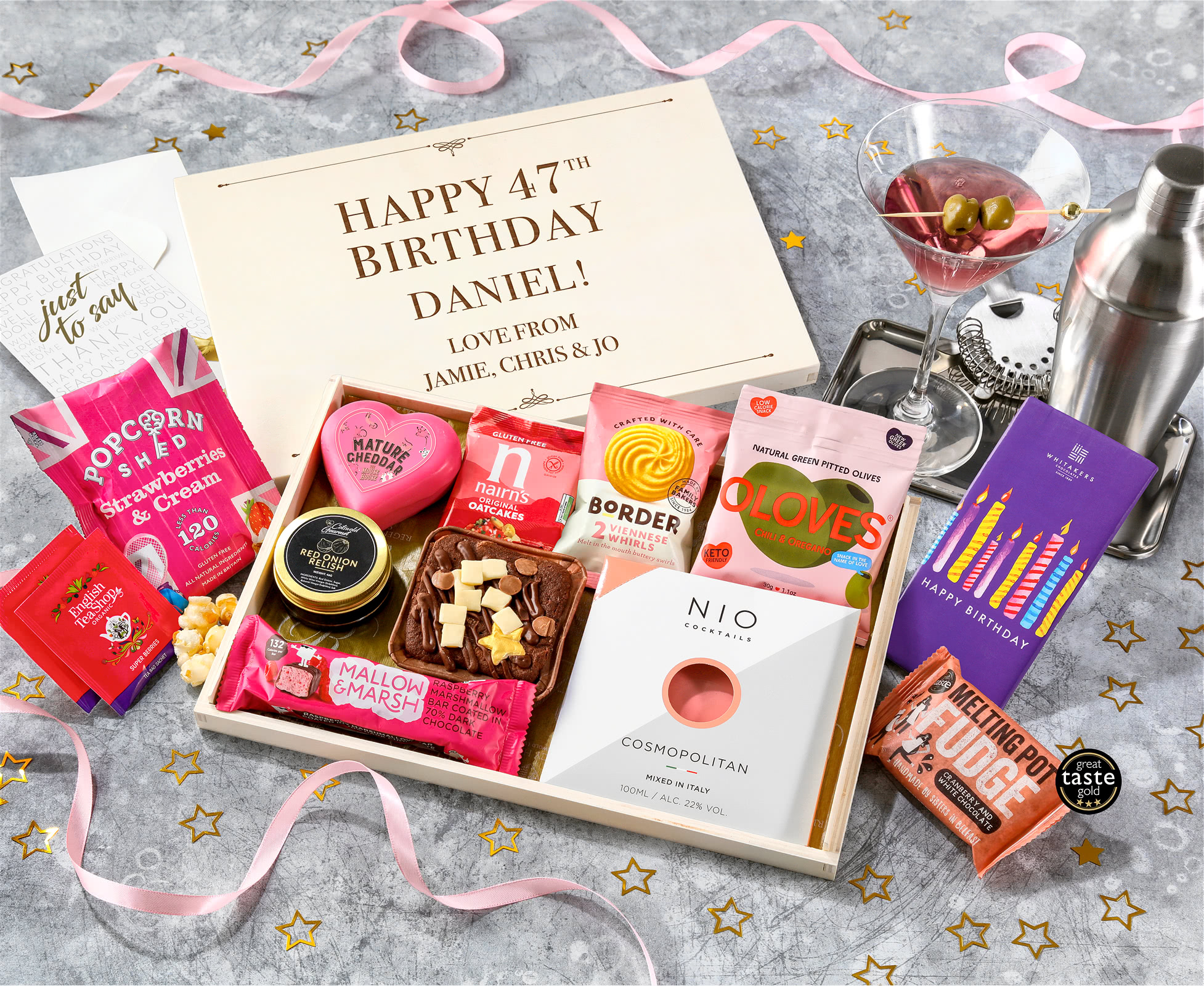 Elegant Cocktail Experience: This elegant gift box contains everything needed for a delightful evening of cheese and cocktails. The letterbox gift comes with Wainwright's Choice Red Waxed Farmhouse Cheddar, a cheese that pairs up wonderfully to the red onion relish and is very much in the spirit of the traditional cheese platter. Fill out the charcuterie experience with mixed nuts and olives, to go with an iconic ready-to-drink Cosmopolitan cocktail.