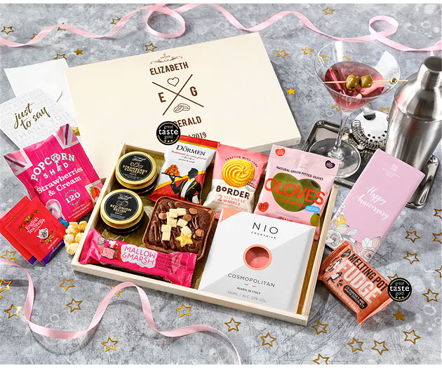 Cocktail Experience: This splendid hamper features a pre-mixed NIO Cosmopolitan cocktail at its core, and is perfectly complemented by artisanal delights that include Divine dark chocolate with raspberries and a Mallow & Marsh's raspberry mallow bar. The pink-themed selection offers a sophisticated drinking and dining experience delivered conveniently through your letterbox.