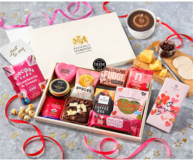 Artisan Cheese Selection: This collection contains Wainwright's Choice Red Waxed Farmhouse Cheddar, presented in a charming heart-shaped truckle. Coupled with Cotswold Gourmet Red Onion Relish and Nairn's Vegan Friendly Oatcakes, this cheese make the perfect romantic nibble.