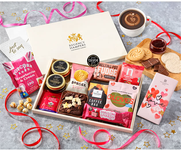 Indulgent Sweet Selection: This lavish hamper spotlights pink-hued delicacies that are off-the-charts deliciousness. It stars Popcorn Shed's Strawberries & Cream popcorn, and then puts the pedal to the metal with Cotswold's luscious Strawberry Conserve and raspberry-infused delights from Reids of Caithness, whose shortbread is unfailingly divine. Mallow & Marsh's dark chocolate raspberry mallow bar is one of the more sultry delights in this selection, with handcrafted Cranberry & White Chocolate Fudge as a sweet counterpoint.