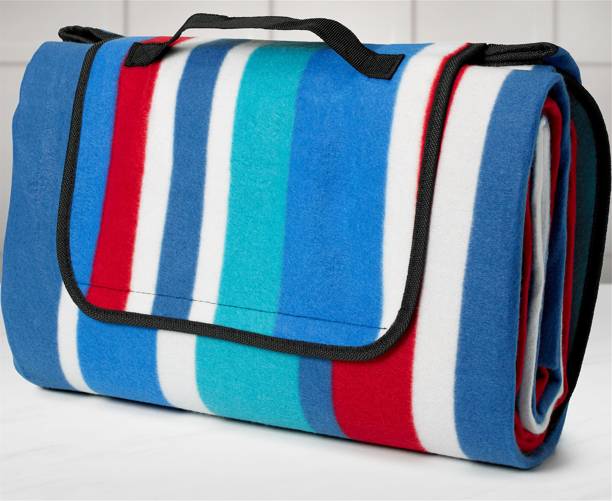 This attractive and practical striped picnic blanket is so easy to carry as it folds up into a neat and compact pack with its own carry handle. Our extra large Sky Blue, Red and White Striped Picnic Blanket is perfect for six people to sit on in comfort while eating outdoors. Its waterproof backing comfortably insulates you from damp ground. It can even be used as a convenient tent carpet when you’re camping. Whether you are relaxing on the grass or at the beach, this picnic blanket is a stylish and useful travelling companion for holidays and trips out.