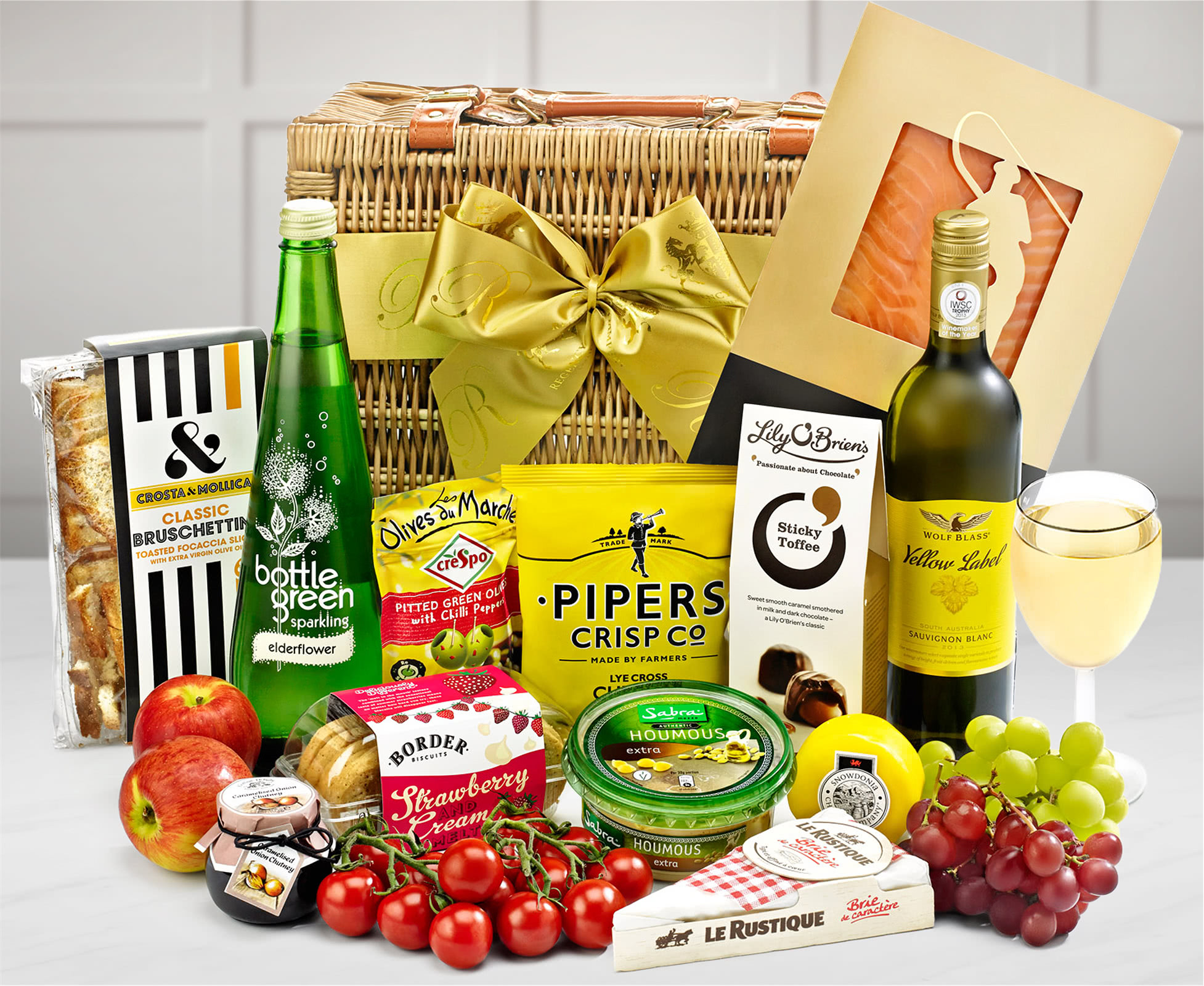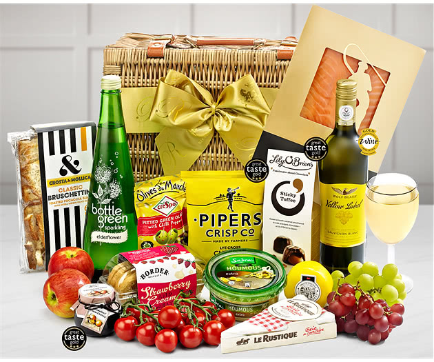 This magnificent Badminton Picnic Hamper with White Wine contains wonderful picnic food and drink featuring an excellent Wolf Blass Yellow Label Sauvignon Blanc Wine plus a bottle of Organic Cranberry Crush Sparkling Presse from Luscombe. You'll also find a selection of fresh fruit including apples and grapes as well as ripe cherry tomatoes to accompany Severn & Wye's Premium Smoked Salmon, creamy Sabra Greek Houmous and Crespo's Pitted Green Olives with Chilli Peppers. We then include two excellent cheeses with a Snowdonia Smoked Mature Cheddar Truckle and Le Rustique Brie accompanied by Caramelised Onion Chutney as well as Pipers Lyecross Cheddar and Onion Crisps and Oregano Crostini. To complete this perfect picnic hamper we add White Chocolate and Strawberry Cookies from Border Biscuits and a pack of Lily O'Brien's award-winning Sticky Toffee Chocolates. As this gift hamper contains alcohol it is not suitable for under 18s.