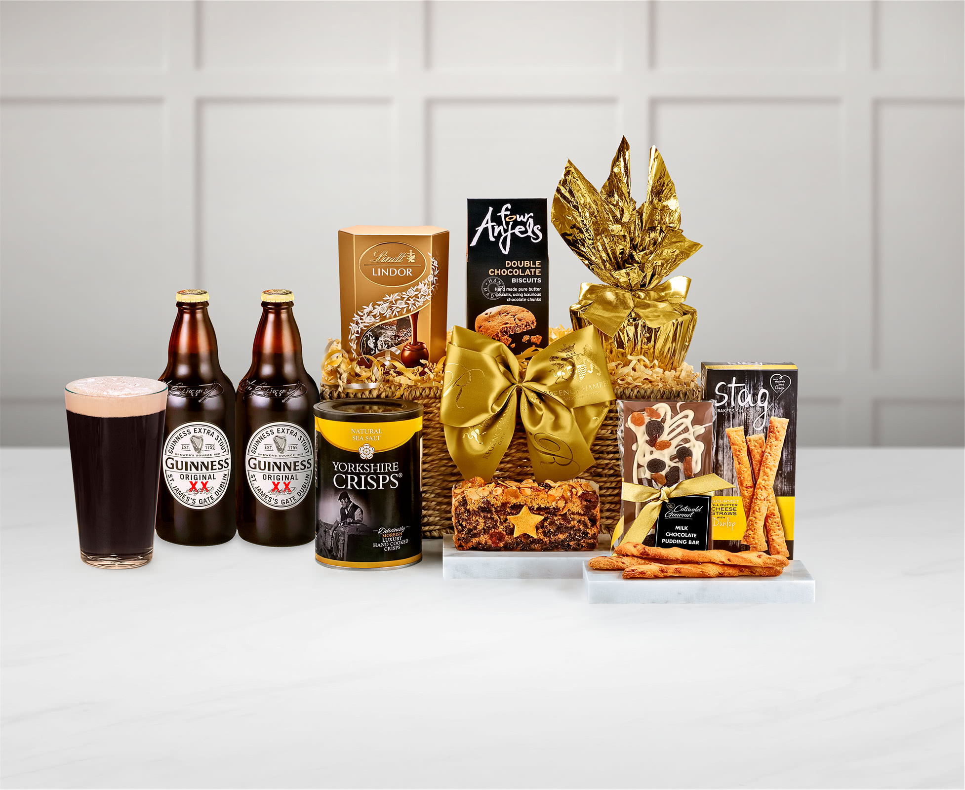 This Chedworth Hamper with Guinness includes two bottles of this world-famous Irish stout brewed at the St James's Gate Brewery in Dublin together with a tempting range of savoury and sweet treats from Yorkshire Crisps to Swiss chocolate truffles. Inside this attractive sea-grass tray you'll find two bottles of Guinness stout beer plus such complementary savoury snacks as Arden's Cheddar Cheese Twists and Natural Sea Salt Yorkshire Crisps. Sweet pleasures include Four Anjels Double Chocolate Biscuits together with Fruit and Nut Slab Cake with Marzipan Star from The Cotswold Gourmet and a classic Strawberry Steamed Pudding. To complete this Chedworth Hamper with Guinness from Ireland we add a pack of Lindor Assorted Chocolate Truffles created by the famous chocolatiers from Switzerland, Lindt. Choose the best delivery date for this Chedworth Hamper with Guinness when you place your order. And remember to add your own personalised message of greetings.