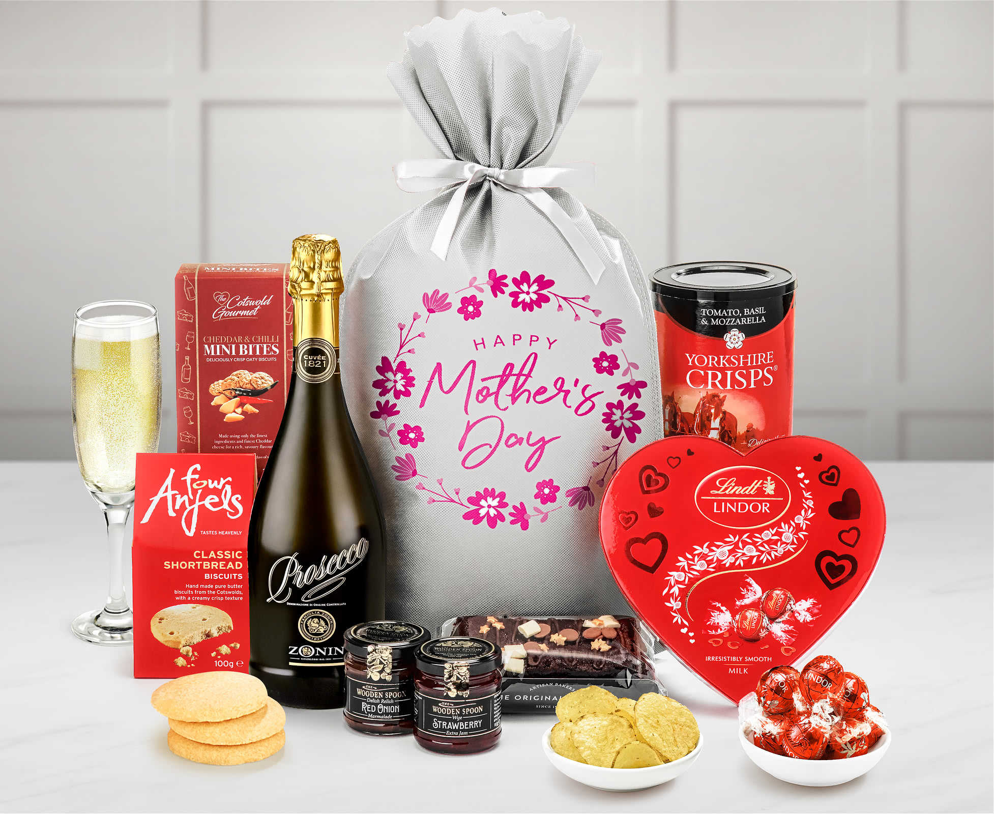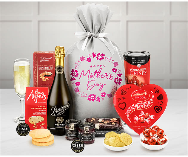 Sparkling Celebration: This delightful gift basket features Zonin Prosecco DOC Millesimato. It's perfectly matched with gourmet goodies that include extra jam made by Wooden Spoon from strawberries and champagne, and a box of Lindt Amour chocolates presented in an elegant, heart-shaped box. These gifts form the irresistible foundation for a celebratory toast.