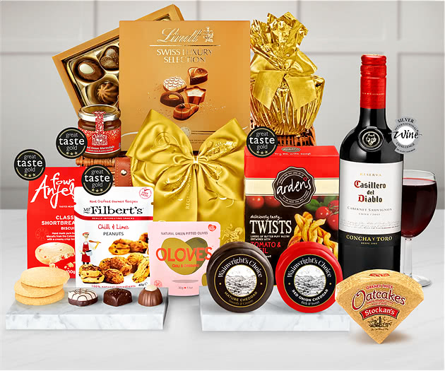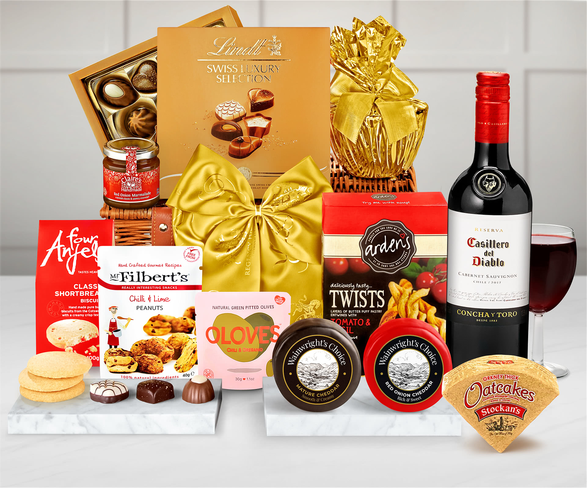 This beautiful Edinburgh Hamper with Red Wine in its lovely willow hamper is an ideal present for lovers of fine wine, savoury treats and Swiss chocolate truffles. As well as a superb bottle of award-winning Casillero del Diablo Cabernet Sauvignon full-bodied red wine this attractive hamper contains two award-winning British cheeses: Snowdonia Select Extra Mature Cheddar and Ilchester Wensleydale with Cranberries. The Edinburgh hamper's sumptuous savoury selection also features Arden's Tomato & Basil Puff Pastry Twists, The Dormen's 'Perfectly Scrumptious' Spicy Peanuts, Claire's Handmade Red Onion Marmalade and a jar of Chilli & Oregano Olives. For sweet treats we add Four Anjels Cotswold Luxury Shortbread plus a traditional Strawberry Pudding from The Cotswold Gourmet. To complete this Edinburgh Hamper we add a pack of mouth-watering Lindor Assorted Swiss Chocolate Truffles. You can set the date for delivery when you place your order for this handcrafted Edinburgh Hamper while also adding your own choice of personalised message. '.