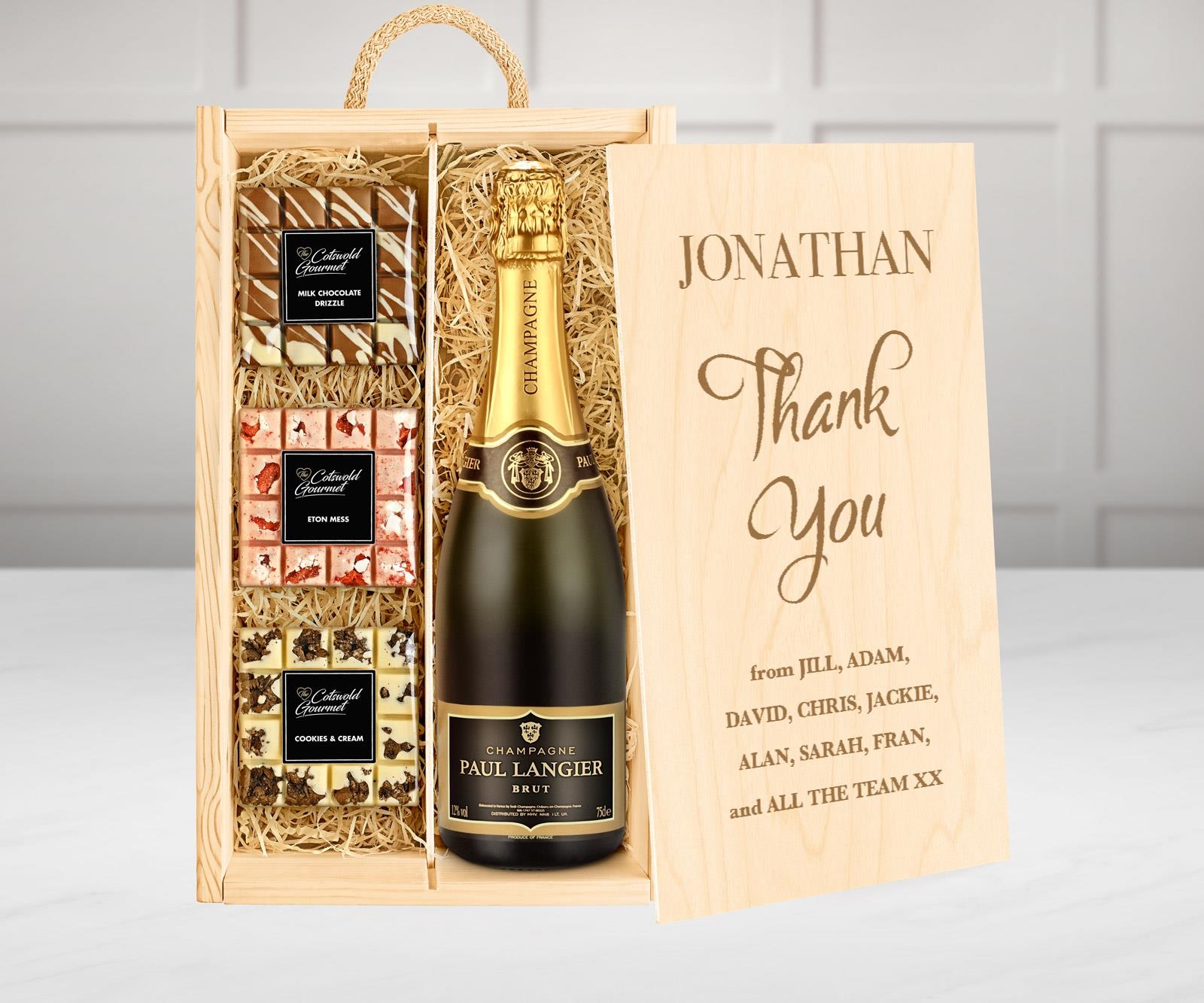 Our Chocolate & Champagne Tasting Experience Gift Box pairs indulgent Champagne with luxury chocolates by The Cotswold Gourmet, exclusively hand-made and specially-chosen for their complementary flavour profile. The three-strong tasting ensemble includes Cookies & Cream', 'Eton Mess' and Milk Chocolate Drizzle varieties alongside Paul Langier's 75cl Brut Champagne, all arranged in a wooden presentation case which can be personalised with your choice of occasion-specific design, themed gift-ribbon and greeting message. '.