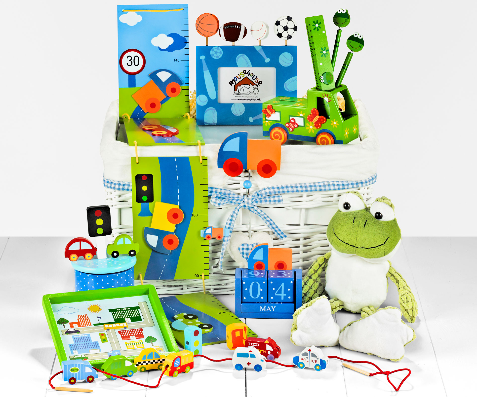 A wonderful car-themed gift, the I Like Driving In My Car Hamper is packed with a motorcade of delightful car and truck presents for any child who loves playing with toy vehicles. This pretty and practical high-sided willow tray contains so many exciting motor-themed presents with a series of attractive gifts from the MouseHouse collection with their superb wooden toys and cuddly soft animals. Popular gifts for a young motor enthusiast include a delightful truck and road-themed height chart and a charming wooden car music box which plays an alphabet song. There's also a wooden car transport threading toy, car-themed wooden blocks calendar and a cute wooden lorry coat-hook. Further gifts feature a wooden lorry-shaped stationery/money box and a sport-themed wooden picture frame. We know that Mr Toad loved fast cars but this charming whitewashed willow basket with its pretty blue and white gingham cotton liner contains a ‘Friendly Frog' cuddly backpack who sits among all the delightful cars and lorries of the I Like Driving In My Car Hamper.