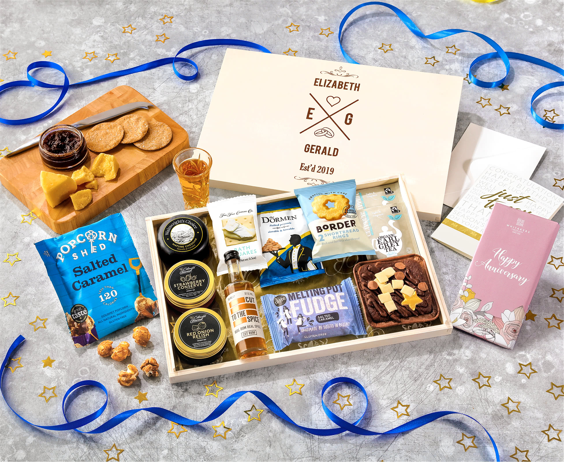 Anniversary Biscuit, Cheese & Cake Tea Time Letterbox Hamper With Spiced Rum