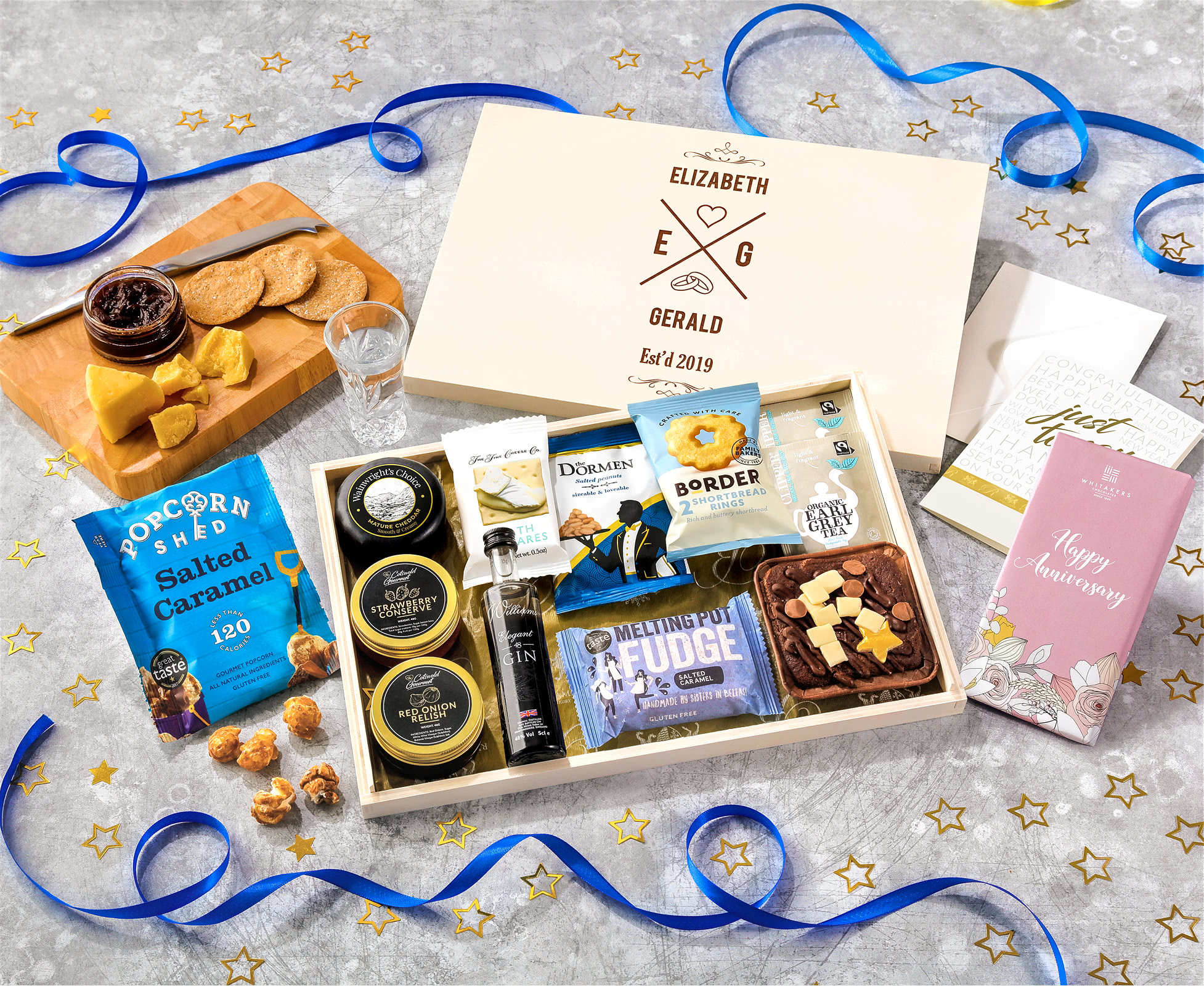 Anniversary Biscuit, Cheese & Cake Tea Time Letterbox Hamper With Williams Gin