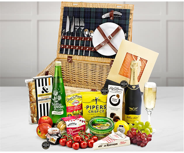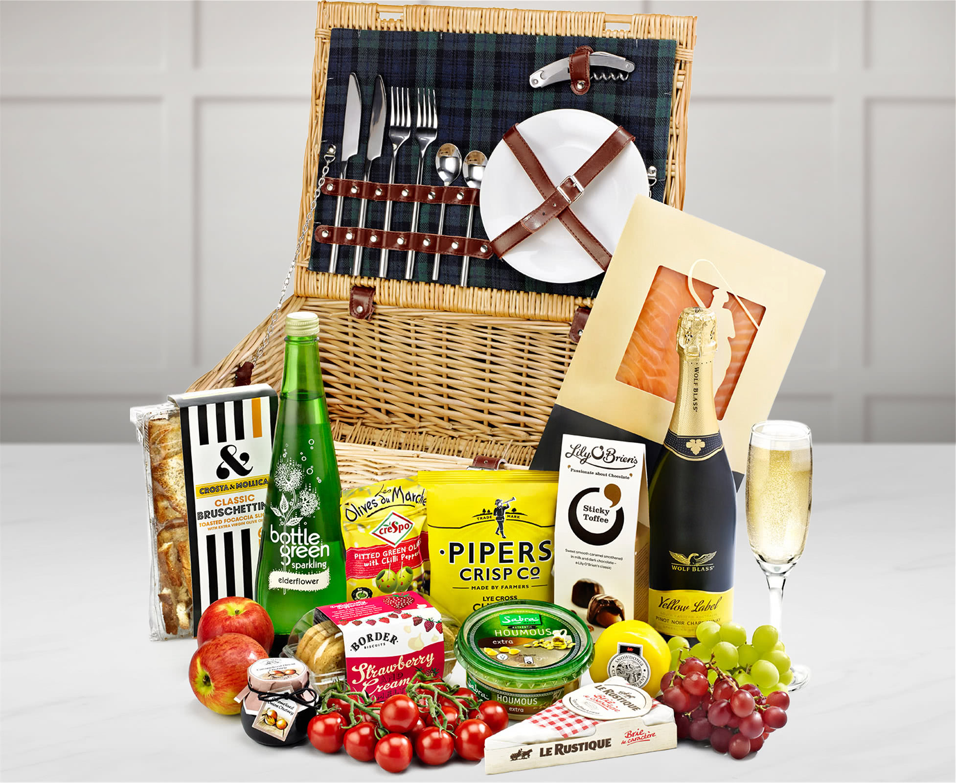 This stylish Badminton Fitted Picnic Hamper with Sparkling Wine contains a superb selection of food and drink with its bottle of Wolf Blass Yellow Sparkling Brut Wine plus a bottle of Luscombe's Organic Cranberry Crush Sparkling Presse. Within this elegant fitted picnic basket containing plates and cutlery for four people, we also provide a selection of fresh fruit including apples, grapes and ripe cherry tomatoes. This fresh fruit complements the Severn & Wye's Premium Smoked Salmon, creamy Greek Houmous and Green Olives with Chilli Peppers. You'll also discover two excellent cheeses with a Snowdonia Smoked Mature Cheddar Truckle and Le Rustique Brie from France accompanied by Caramelised Onion Chutney as well as Lyecross Cheddar and Onion Crisps and Oregano Crostini. To complete this fine picnic hamper in style we add delicious White Chocolate and Strawberry Cookies and a pack of Lily O'Brien's Sticky Toffee Chocolates. As this gift hamper contains alcohol it is not suitable for under 18s.