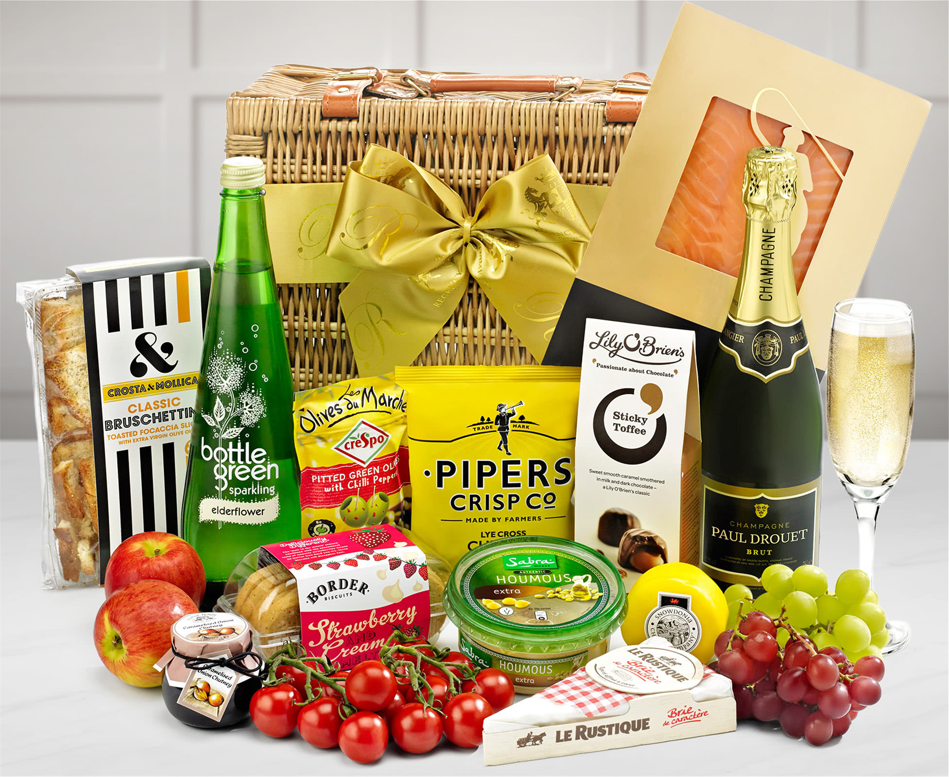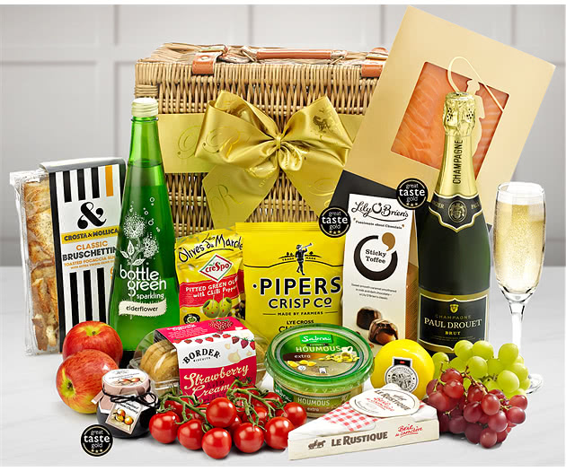 This stylish Badminton Picnic Hamper with Champagne contains an excellent selection of picnic food and drink with a superb bottle of Paul Langier Champagne plus a bottle of Luscombe's Organic Cranberry Crush Sparkling Presse. We also provide a selection of fresh fruit including apples, grapes and ripe cherry tomatoes which complement Severn & Wye's Premium Smoked Salmon, creamy Greek Houmous and Pitted Green Olives with Chilli Peppers. You'll also discover two excellent cheeses with a Snowdonia Smoked Mature Cheddar Truckle and Le Rustique Brie from France accompanied by Caramelised Onion Chutney as well as Lyecross Cheddar and Onion Crisps and Oregano Crostini. To complete this fine picnic hamper in style we add delicious White Chocolate and Strawberry Cookies and a pack of Lily O'Brien's Sticky Toffee Chocolates. As this gift hamper contains alcohol it is not suitable for under 18s.